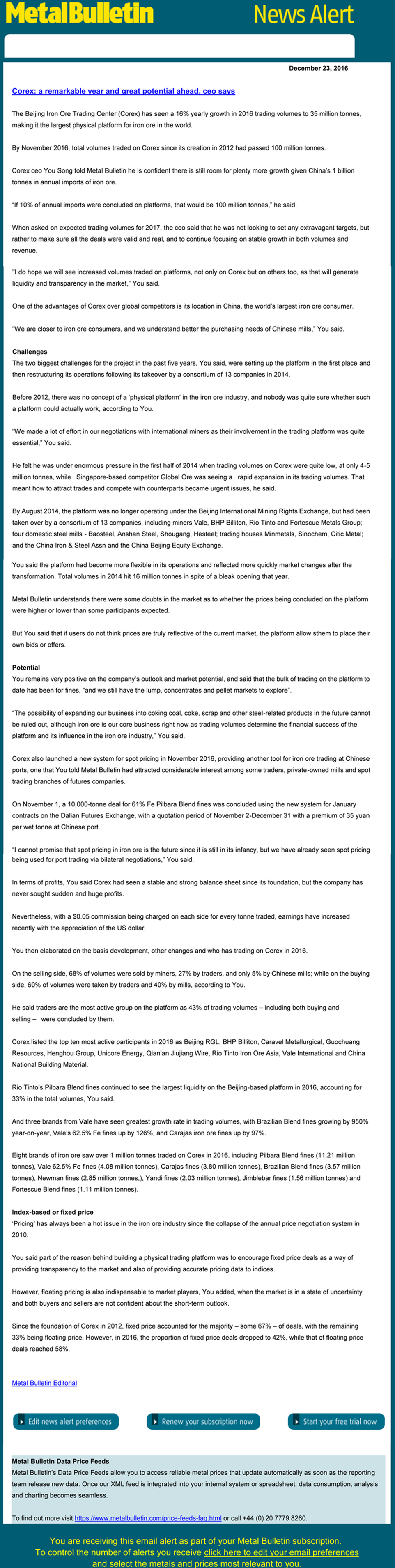 2016年中國鐵礦石現貨交易平臺會員年會期間,北鐵中心總裁游松接受了英國金屬導報(Metal Bulletin)的采訪,金屬導報是一家專業報道金融、礦業資訊的全球化新聞媒體。