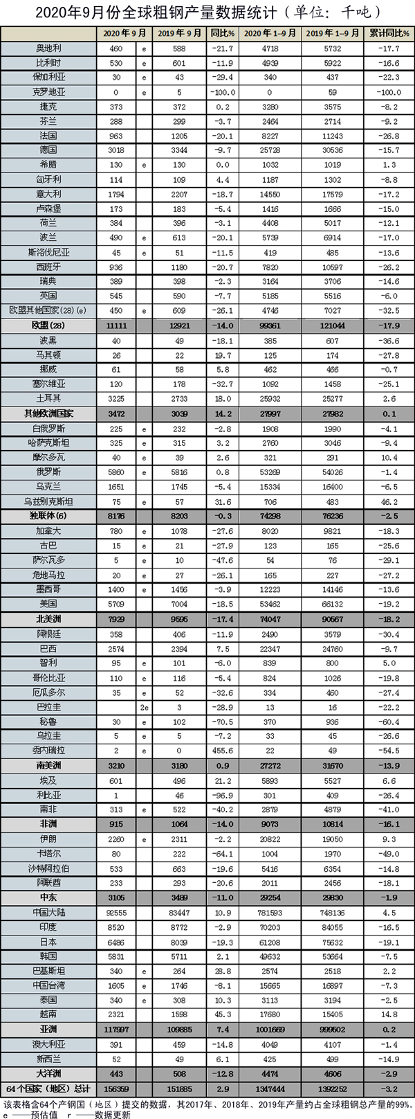 10月23日,世界鋼鐵協會(WSA)發布了9月份全球粗鋼產量數據。9月份,全球64個納入世界鋼協統計的國家和地區粗鋼產量為1.564億噸,同比增長2.9%。