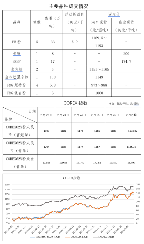 2月22日-2月26日成交21筆共76.6萬噸,其中在途3筆46萬噸,港口18筆30.6萬噸。