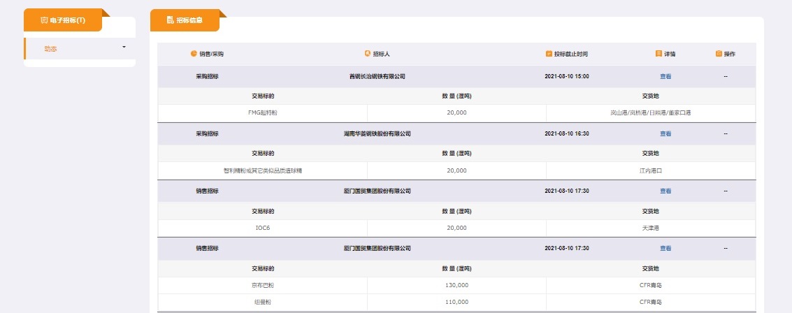 為進一步提升綜合服務能力,滿足行業企業對交易合規性、便利性和購銷渠道多元化的需求,北鐵中心聯合廈門國貿集團等單位,在深入調研的基礎上推出了鐵礦石現貨電子招標系統。據悉,該系統上線當日,廈門國貿、華菱鋼鐵、河鋼國際、首鋼長治等企業通過系統發布招標信息,合計30萬噸,購銷品種包括FMG超特粉、巴粗、智利精粉、紐曼粉等品種,交貨地涵蓋天津港、嵐山港、嵐橋港、日照港、青島港、董家口港及江內港口。