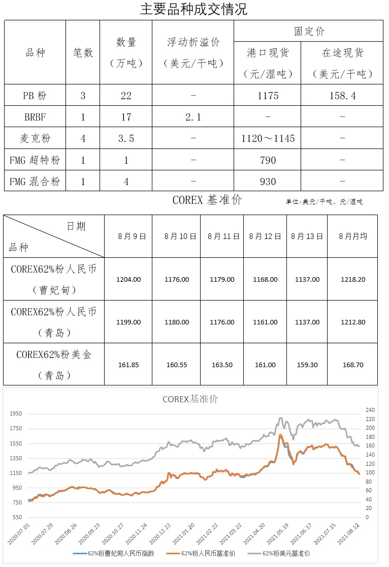 8月9日-8月13日成交17筆共55.8萬(wàn)噸,其中在途2筆34萬(wàn)噸,港口15筆21.8萬(wàn)噸。