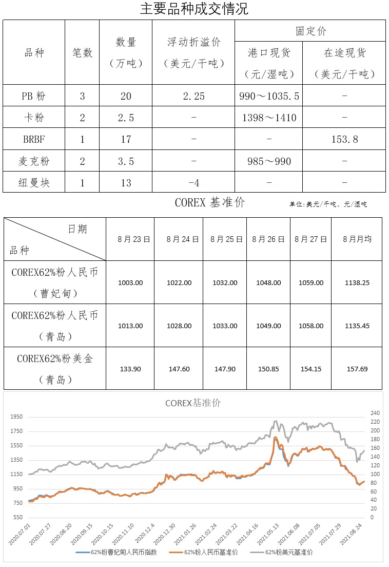 8月23日-8月27日成交9筆共56萬噸,其中在途3筆47萬噸,港口6筆9萬噸。