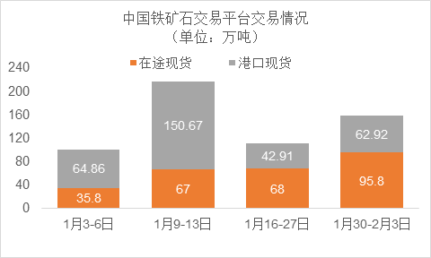 1月30日~2月3日成交64筆共158.72萬噸,其中在途8筆共95.8萬噸,港口56筆共62.92萬噸。主要成交品種包括:PB粉16筆共48萬噸,金布巴混合粉3筆共27萬噸,揚(yáng)迪粉2筆共16萬噸,紐曼粉3筆共3.2萬噸,麥克粉3筆共10.2萬噸,F(xiàn)MG超特粉6筆共3.4萬噸, FMG混合粉6筆共23.9萬噸。