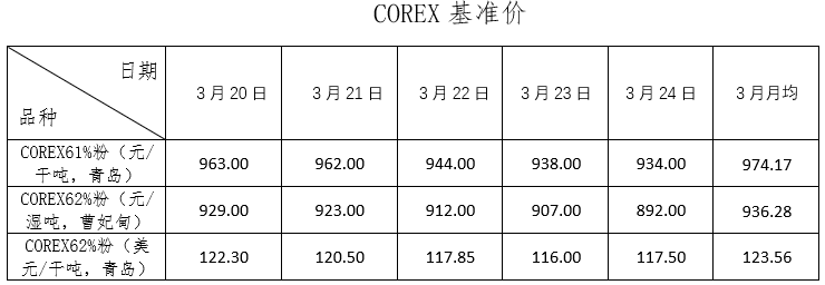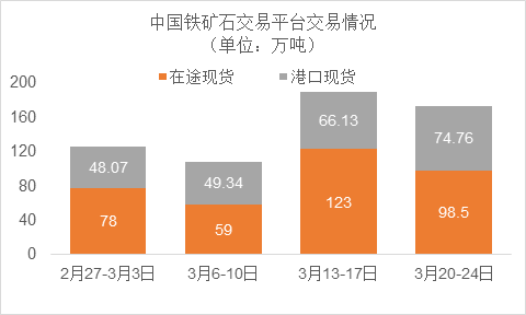 3月20日~3月24日成交79筆共173.26萬噸,其中在途9筆共98.5萬噸,港口70筆共74.76萬噸。主要成交品種包括:PB粉20筆共63.7萬噸,金布巴混合粉5筆共5萬噸,麥克粉2筆共2.2萬噸,揚迪粉3筆共12萬噸,卡拉加斯粉9筆17.8萬噸,F(xiàn)MG混合粉5筆共4萬噸。