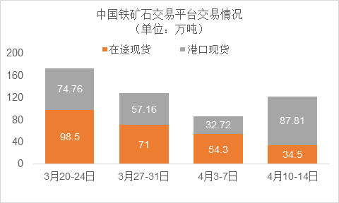 4月10日~4月14日成交72筆共122.31萬噸,其中在途5筆共34.5萬噸,港口67筆共87.81萬噸。主要成交品種包括:PB粉13筆共14.59萬噸,金布巴混合粉2筆共10.6萬噸,麥克粉4筆共5.79萬噸,揚(yáng)迪粉1筆共3萬噸,卡拉加斯粉6筆12.9萬噸,F(xiàn)MG超特粉3筆共3.1萬噸,F(xiàn)MG混合粉9筆共8萬噸。