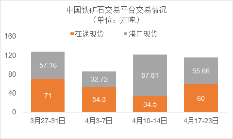 4月17日~4月23日成交63筆共115.66萬(wàn)噸,其中在途5筆共60萬(wàn)噸,港口58筆共55.66萬(wàn)噸。主要成交品種包括:PB粉11筆共28.4萬(wàn)噸,金布巴混合粉5筆共29萬(wàn)噸,麥克粉2筆共7.5萬(wàn)噸,紐曼塊1筆共8萬(wàn)噸,卡拉加斯粉3筆6.57萬(wàn)噸,F(xiàn)MG混合粉4筆共4萬(wàn)噸。